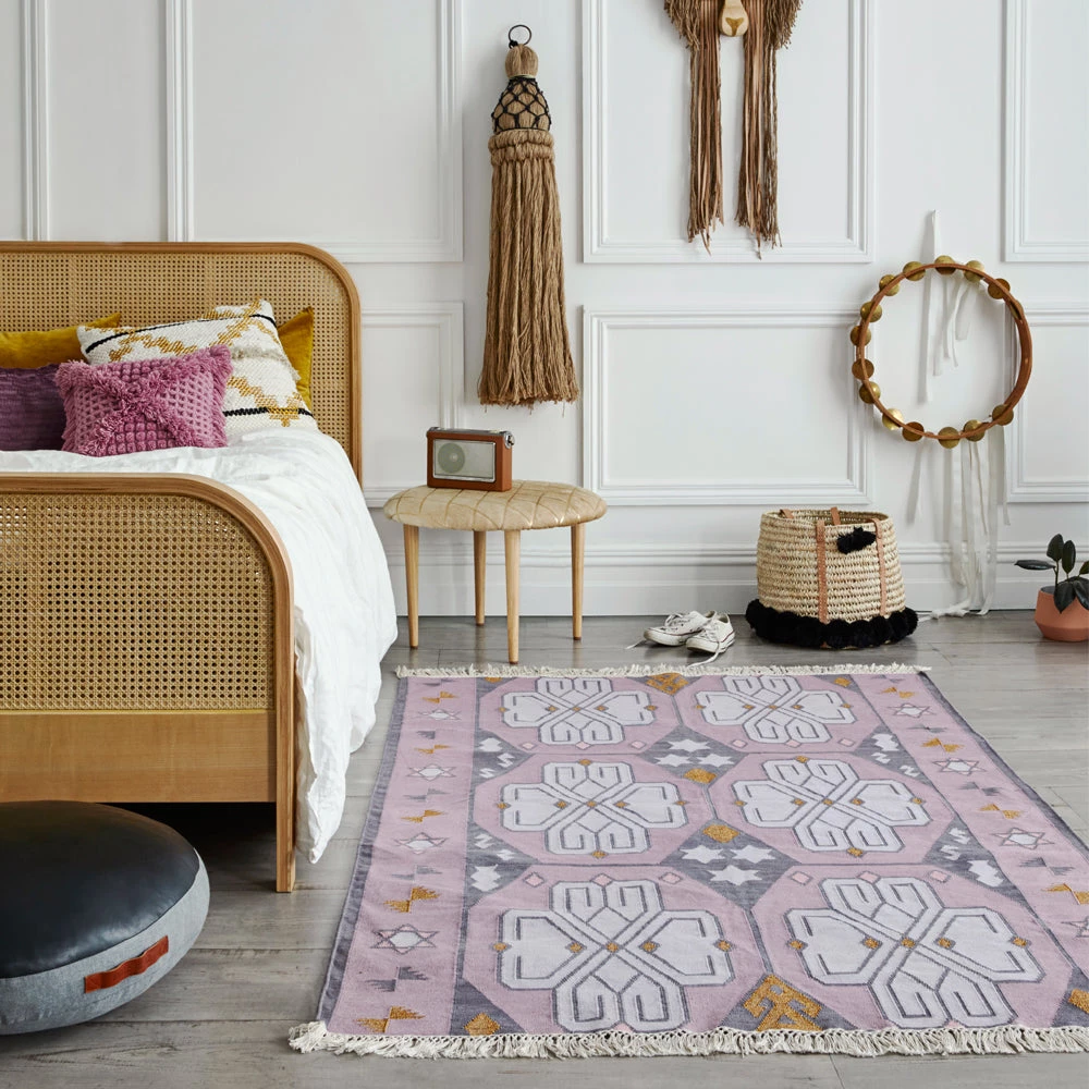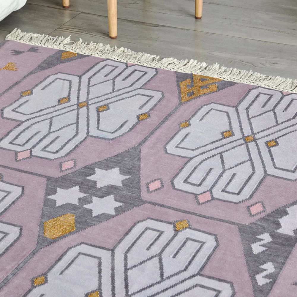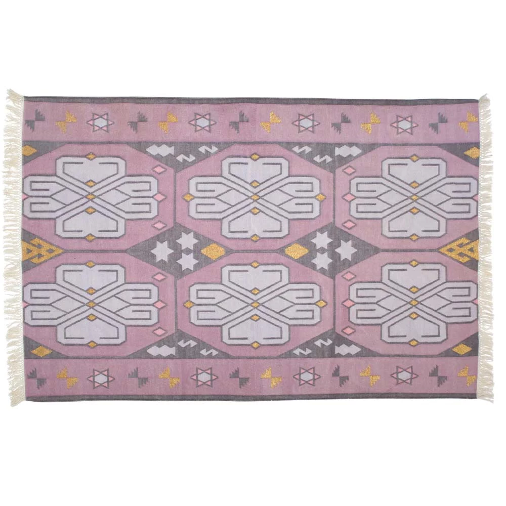 Magic and mystery inspired this beautiful patterned area rug. Drawing from pink, purple and grey hues this floor rug brings a free spirited cheerful aura into your space. Hand woven in India, this cotton dhurrie rug says you have no limits. You are open and free. Whether rolled out in the living room or master suite, this eye-catching area rug acts as both a foundation and a focal point.
