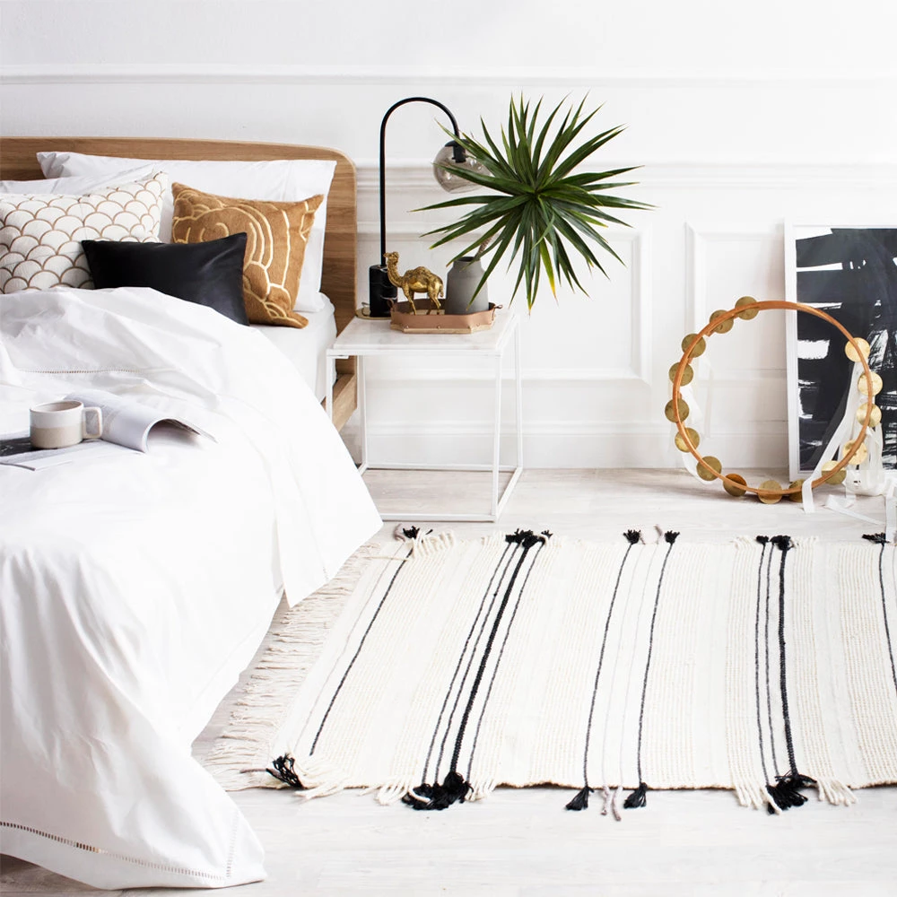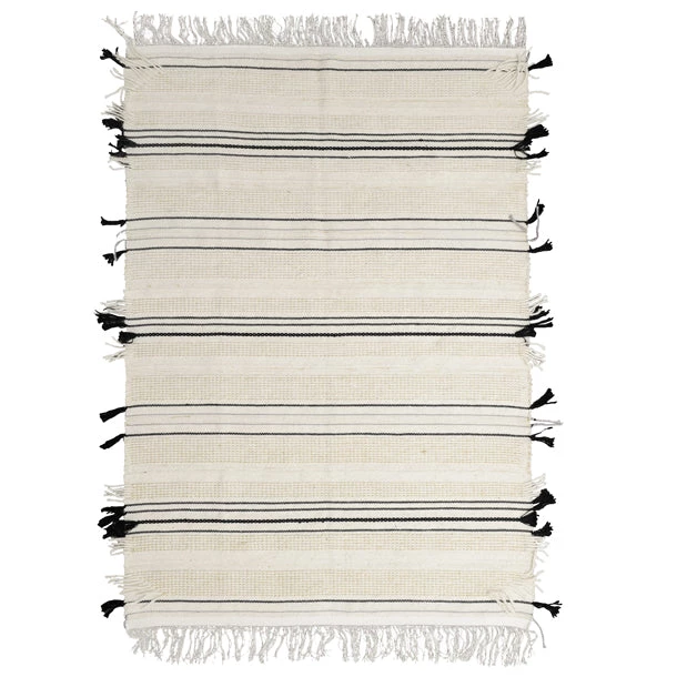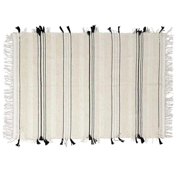 The Lark rug has a serene simplicity, with a luxe edge. It features a subdued monochromatic palette, created from subtle tonal textures and a soft black and grey stripe pattern. Each side features hand-tufted tassels, making this stunning style an inviting rug in any interior.