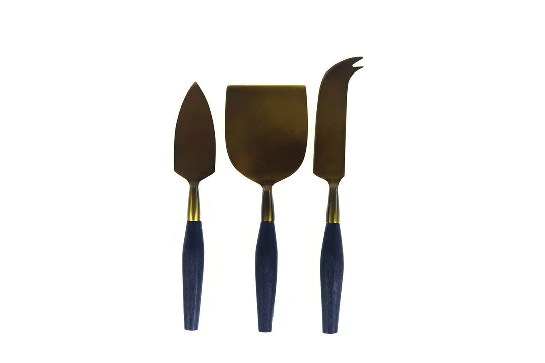 Unique and elegant cheese set that will make serving cheese seem so elegant and fun. The antique bronze complements the black mango wood so well. With our Arendal Cheese Knives, a bit of contrast goes a long way making them a bold addition to any table. Handcrafted from protected groves in India, this dreamy trio boasts a darkened color palette, beautifully accenting its natural striations and subtle highlights.