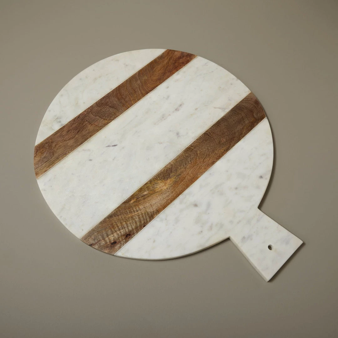 A hand-crafted mix of white marble, reclaimed pine with contrasting strips of natural hardwood, and jute rope tie attached. Imported from India, this stunning marble and wood board makes for a beautiful presentation to serve cheese and charcuterie.