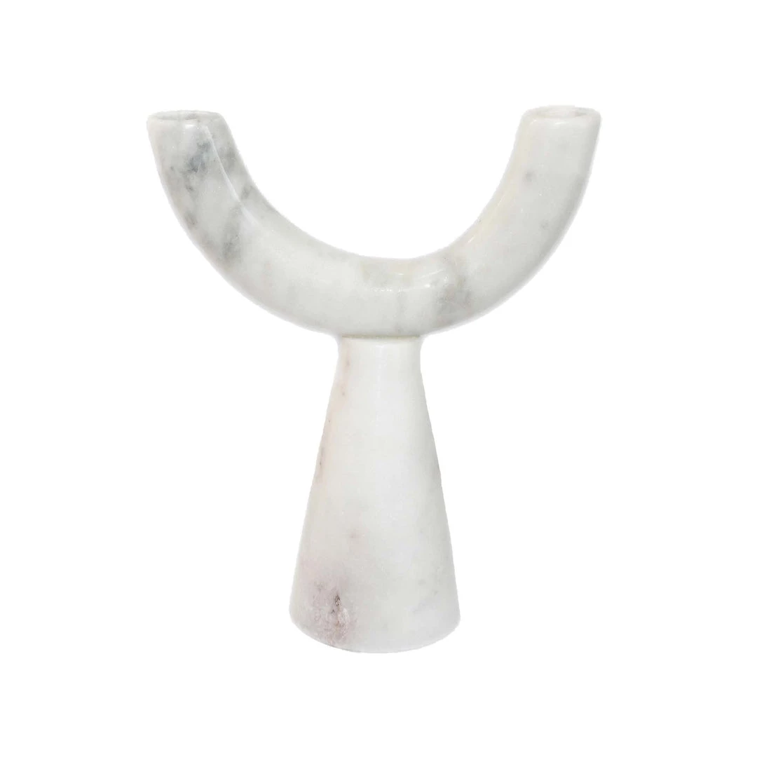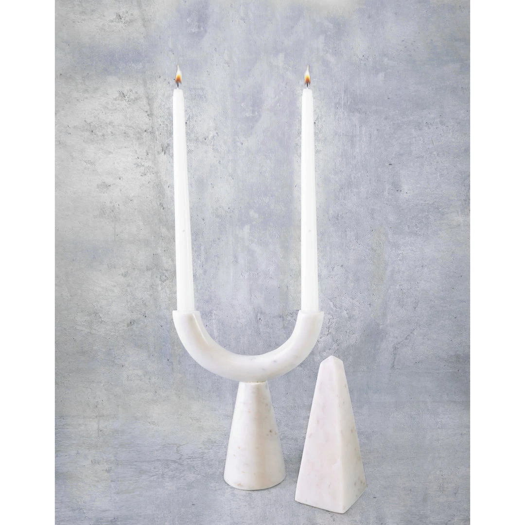 Sculptural pillar candle holder made of marble, the center piece to any mantel. Grouped together, this serves as the perfect center piece for a banquet table. Swap out basic white tapers for a pop of color, this piece is the perfect base to any color candle customized to your design scheme.