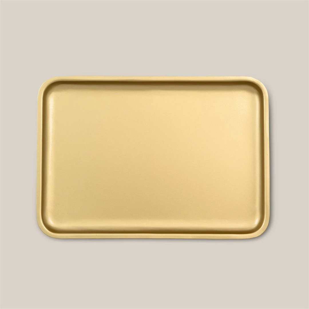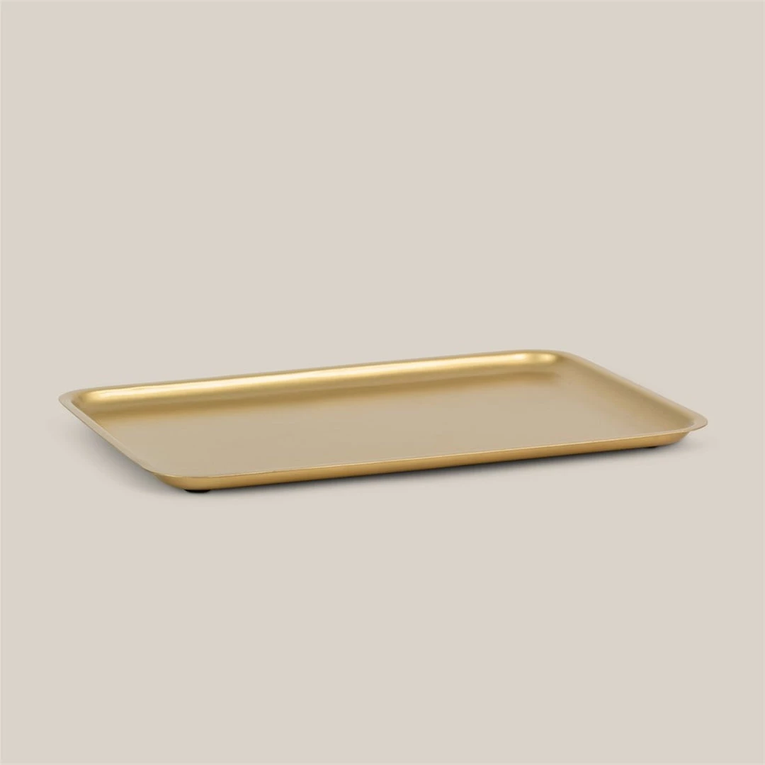 Matte golden serving tray for those radiant mornings with breakfast in bed. This sleek metal tray is perfect for tea service or as a coffee bar. Practical to serve horderves at your next cocktail party or as a decorative piece on your bathroom vanity. The perfect backdrop for all occasions and decor.