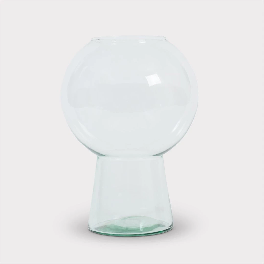 This statement vase is designed with a graphic silhouette, composed of geometric shapes. Lovely with long stemmed flowers or branches and as a complete traditional floral arrangement. With or without foliage, this glass piece stands alone and holds its own on a shelf.