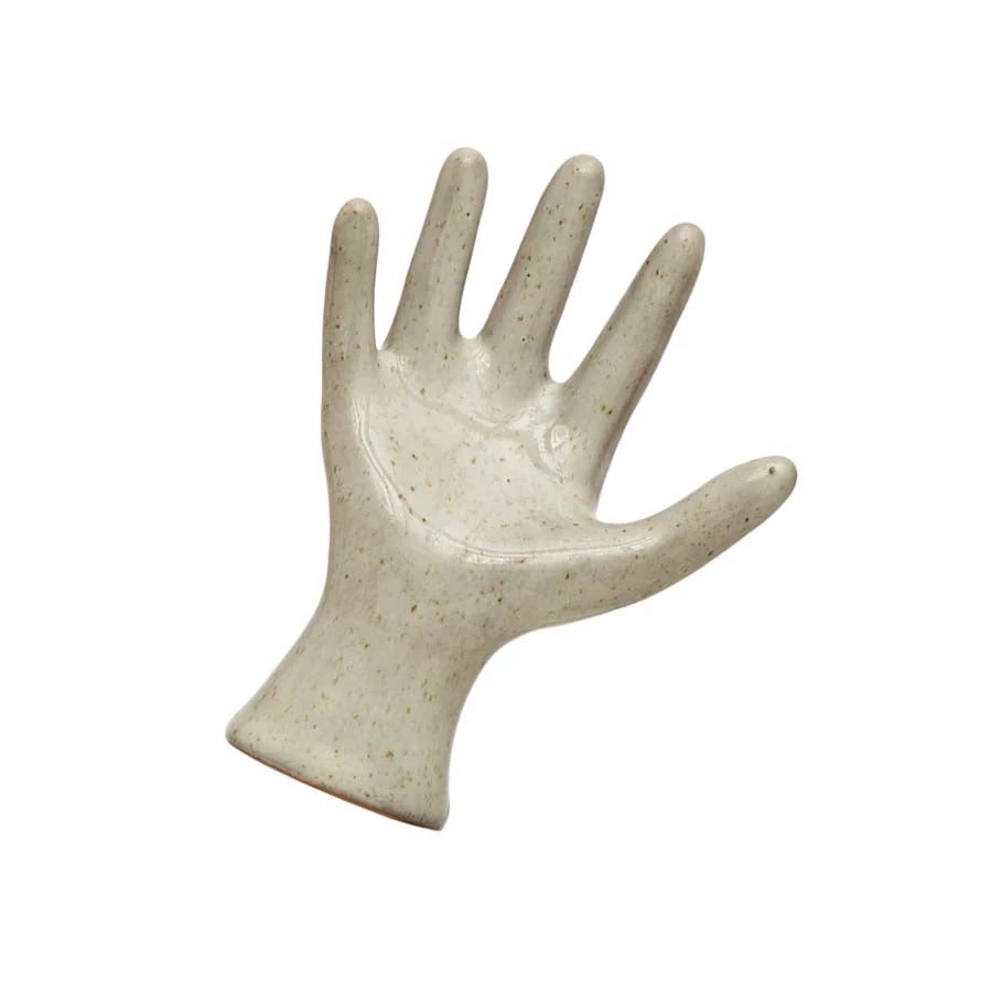 Striking and engaging stoneware hand decor has a cream-colored reactive glaze finish. Stoneware has an opaque milky cream-colored finish with tiny dark flecks through out. A conversation-starting accent for your home décor that will look great on a coffee table, mantel, or side table. Display on a stack of books, boxes or as a stand-alone décor piece.