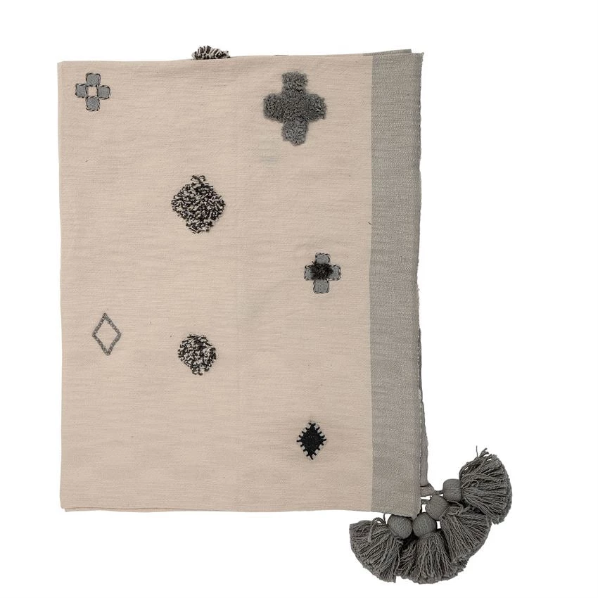 This woven light weight throw is the perfect thing to drape across a bed or the back of a chair. The unique blue embroidery and tassels give a nice contrast with the cream colored background. The cotton material is breathable and perfect for any season.  This blanket pairs perfectly with our Brussels ivory quilt.Â