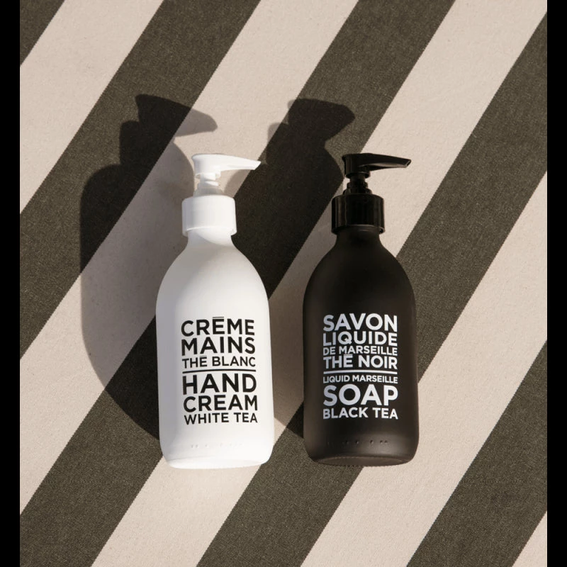 Made in a cauldron according to tradition, as does its ancestor, the authentic cube from Marseille, this liquid soap is elaborated with vegetable oils. Naturally glycerined, it gently cleanses the skin. Presented in a lacquered glass pump-bottle with a timeless and contemporary design which uses the strength of contrast to create an inspiring graphic universe.
