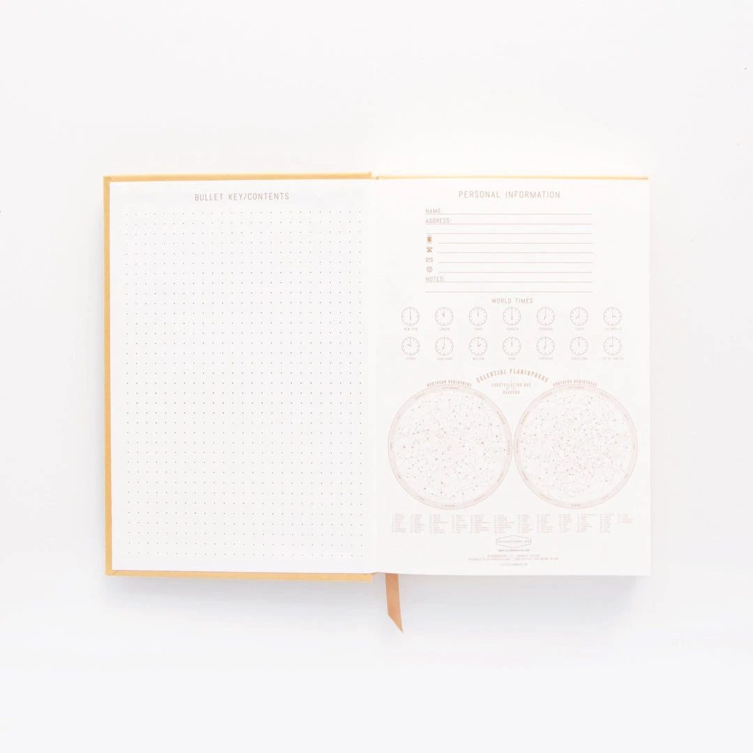 This notebook features a high quality hard cover, expandable interior pocket, and ribbon marker. The handy references include a bullet key/contents, world map, important dates, holiday overview, equivalents/conversions page, and space for personal information. Printed on earth friendly acid-free deluxe quality paper with soy inks, this journal has 160 lined pages with day & month headers. The bright mustard suede cloth cover emotes positive feelings as you tackle the day. The hand sewn binding lays flat so you can write or draw without compromising the integrity of the spine.