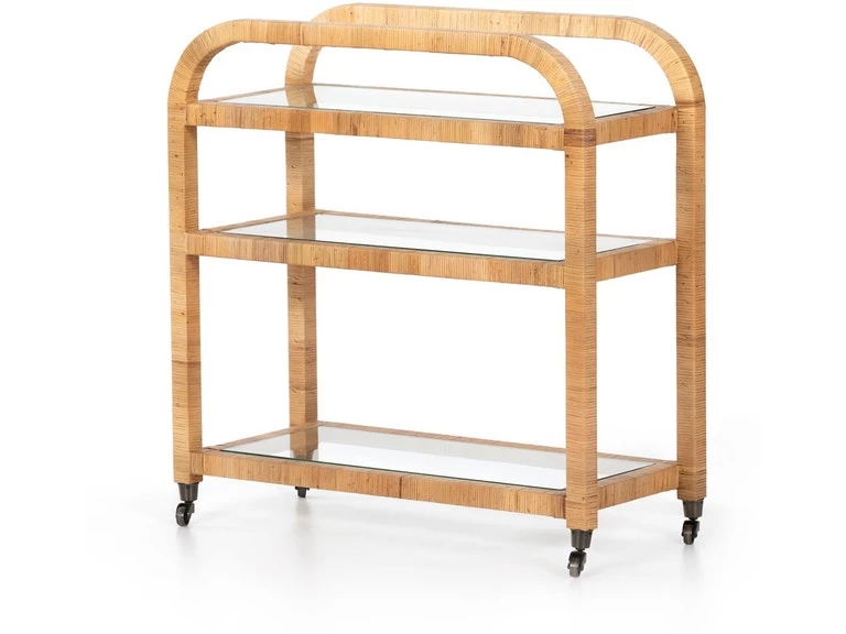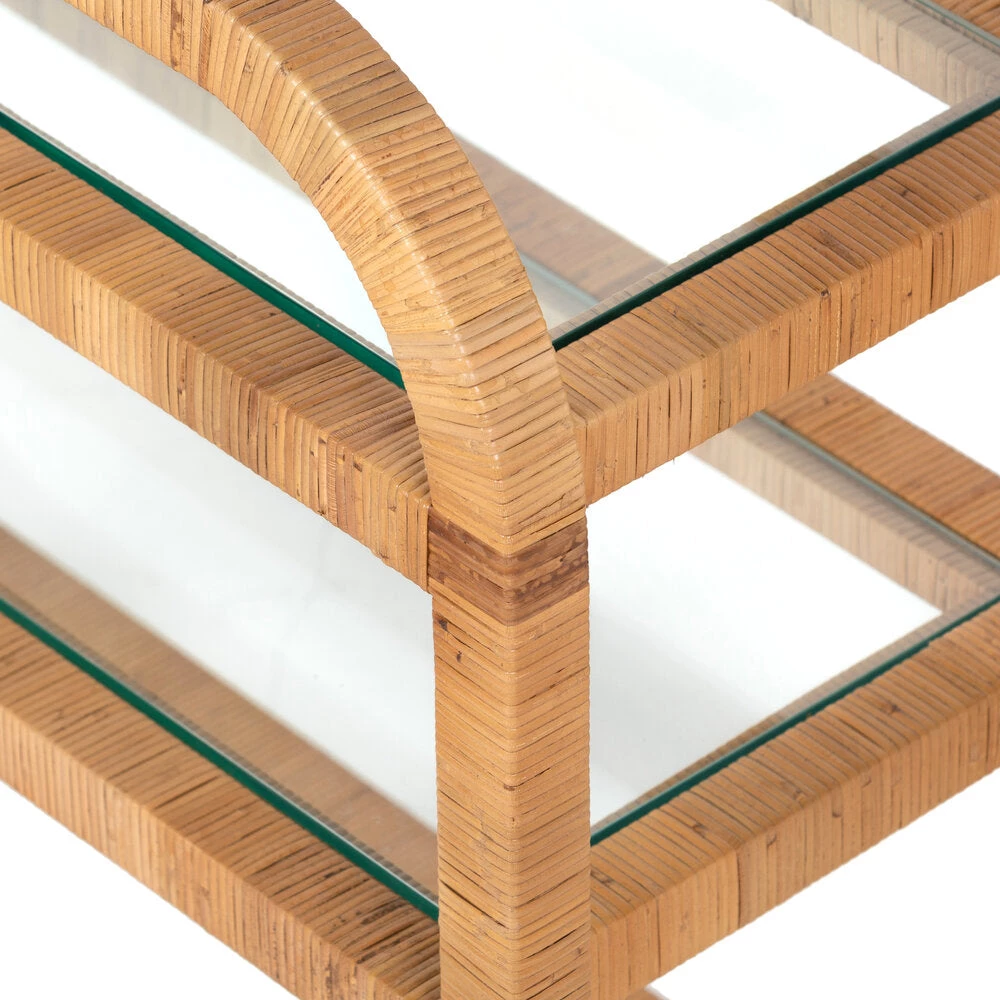 Roll in the party with this rattan bar cart. Honey-finished rattan forms a rounded, seventies-inspired frame for three tiers of tempered glass shelving perfect for storing our cocktail mixers and glasses.
