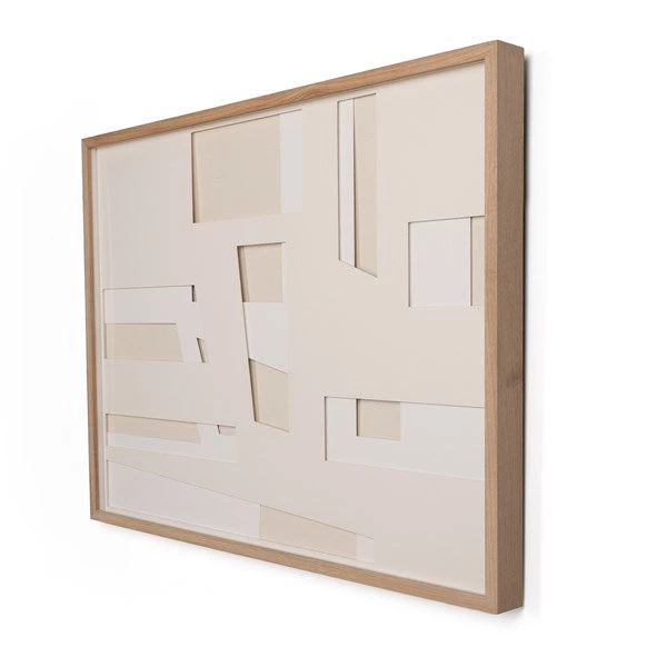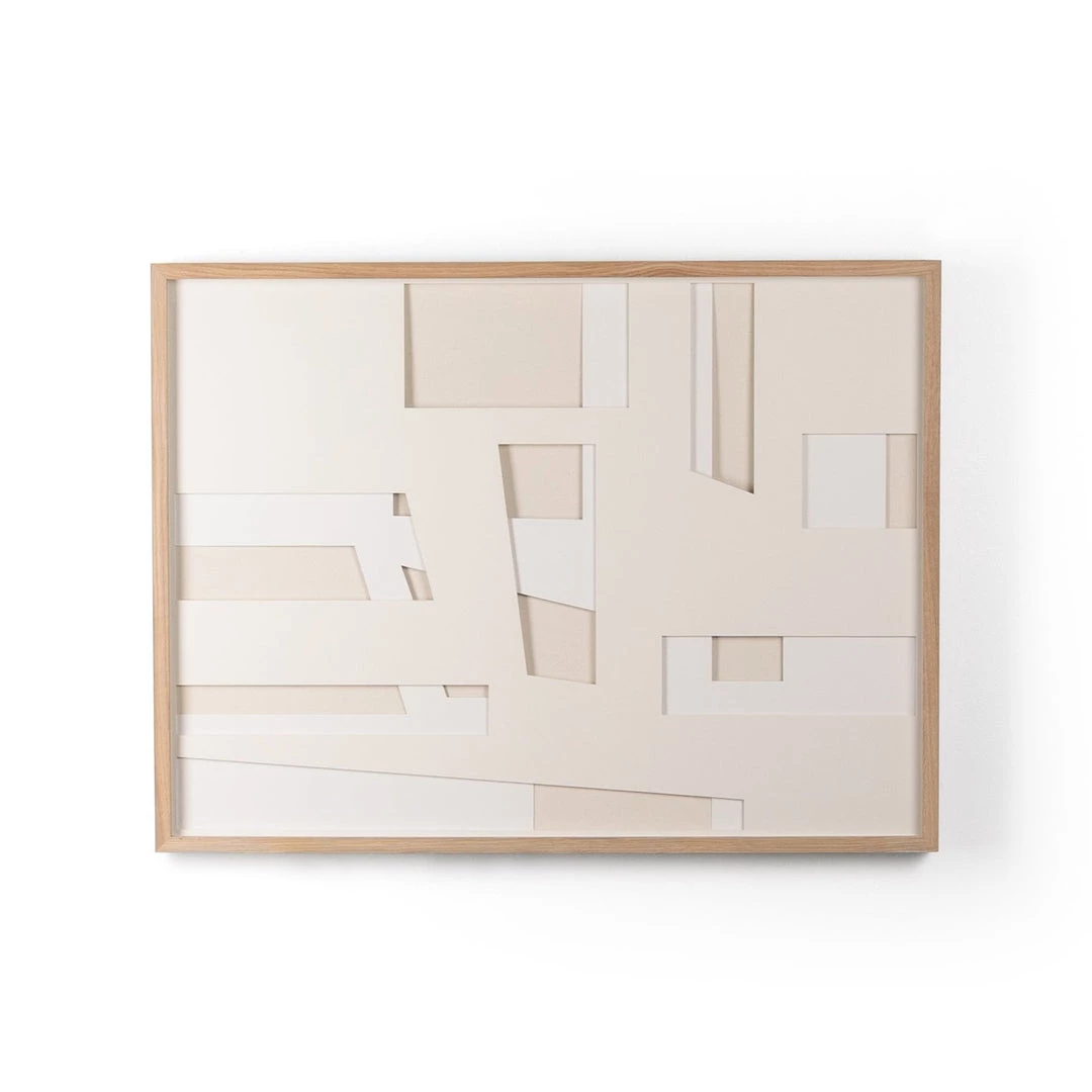 Linear cutouts from layered mat boards, this Dimensions II Art by Bangkok-based art house Coup D’Esprit brings an abstract appeal to any space. Framed within vertical white grain oak for a museum-quality look.