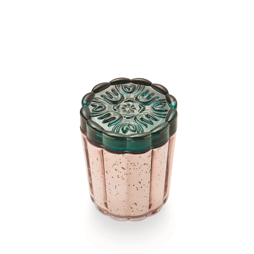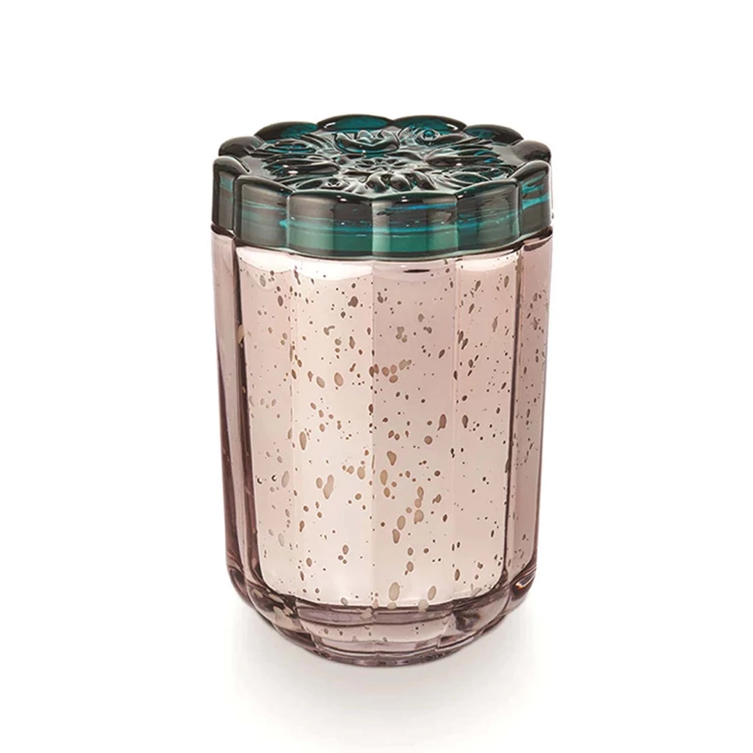 Scents of island pineapple, mango, papaya, and coconut milk swirl with sugarcane and Tahitian vanilla for a gorgeous summertime scent. The gorgeous mercury glass vessel (with a floral pressed glass lid) is one you’d buy all on its own. Once it’s burned through, use the vessel for all of your treasures.