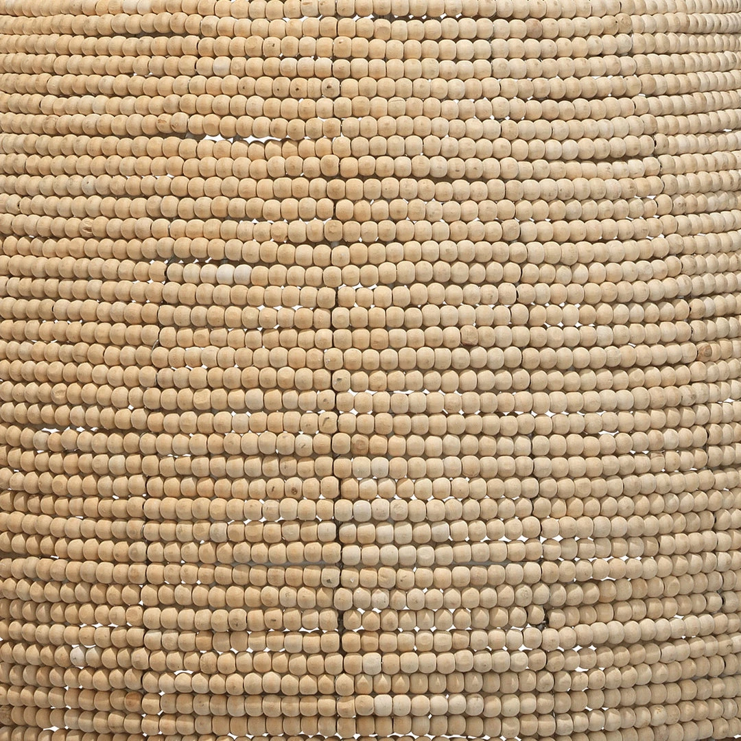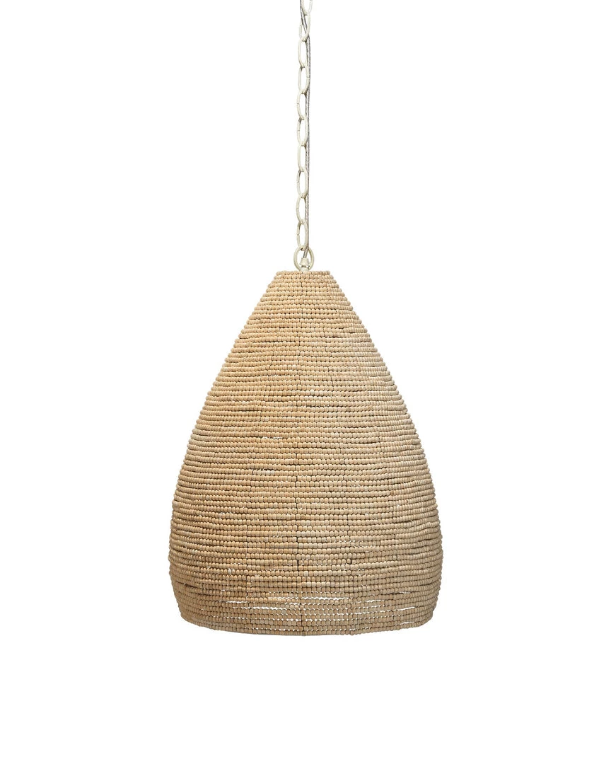Strings of beads made with mango wood line the body of the oversized Gulf Stream Pendant. A white iron chain compliments the natural tone and texture of this piece. A statement piece with repeating patterns and textures like this can help add interest to any coastal palette.