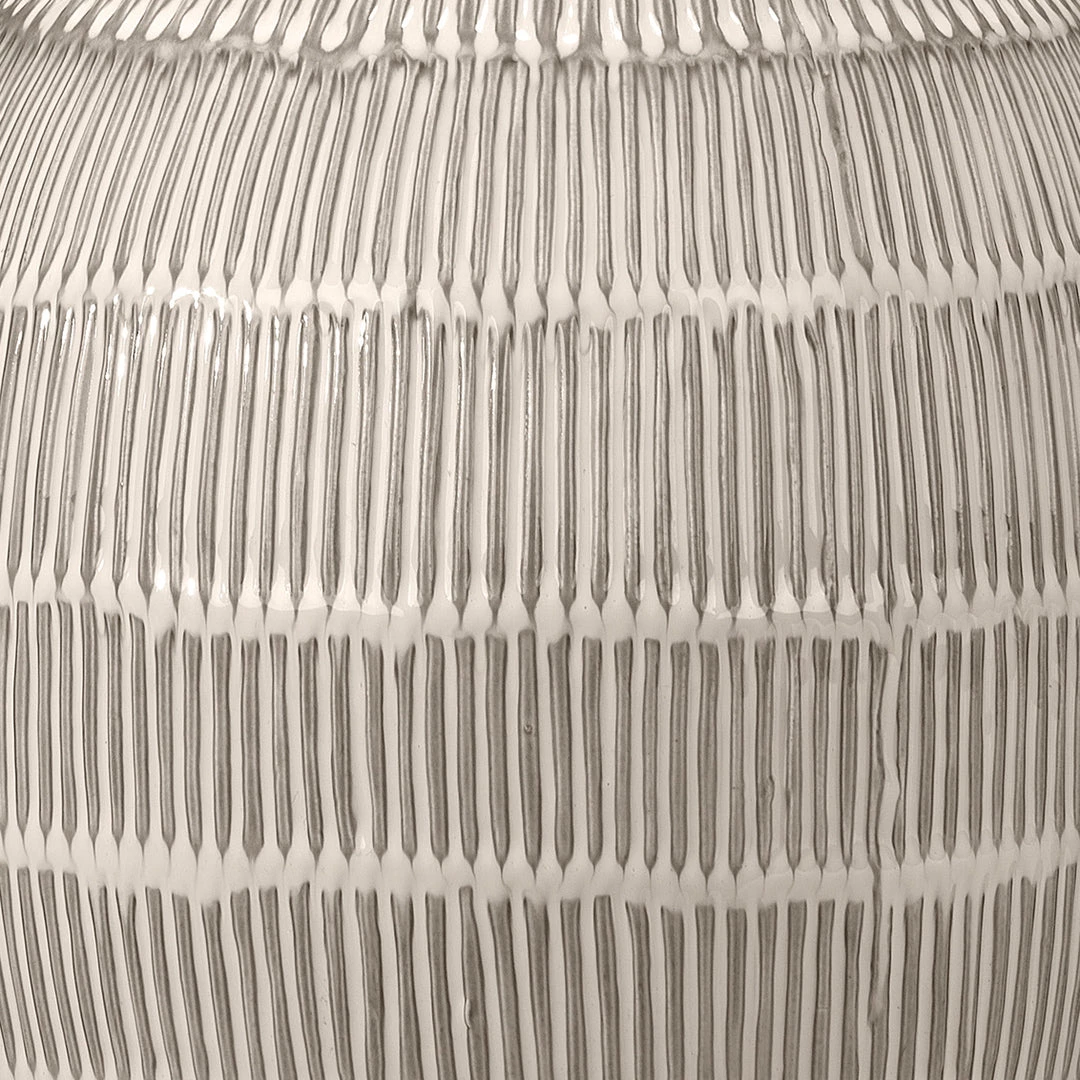 These vertical stripes wrap around the lamp body to also create horizontal stripes on an oval ceramic lamp base. This geometric marvel is paired with a beige faux silk shade to create a perfect neutral piece.