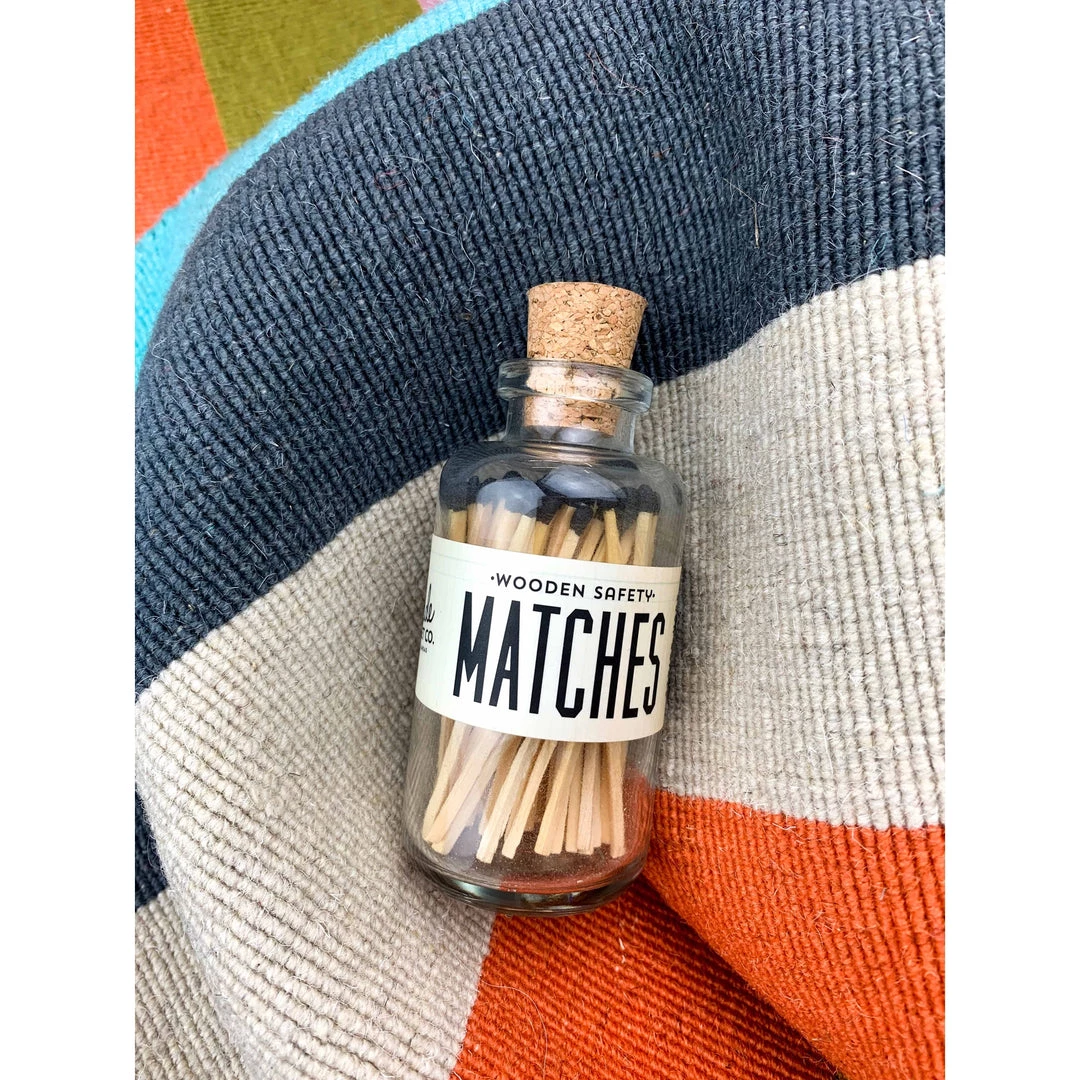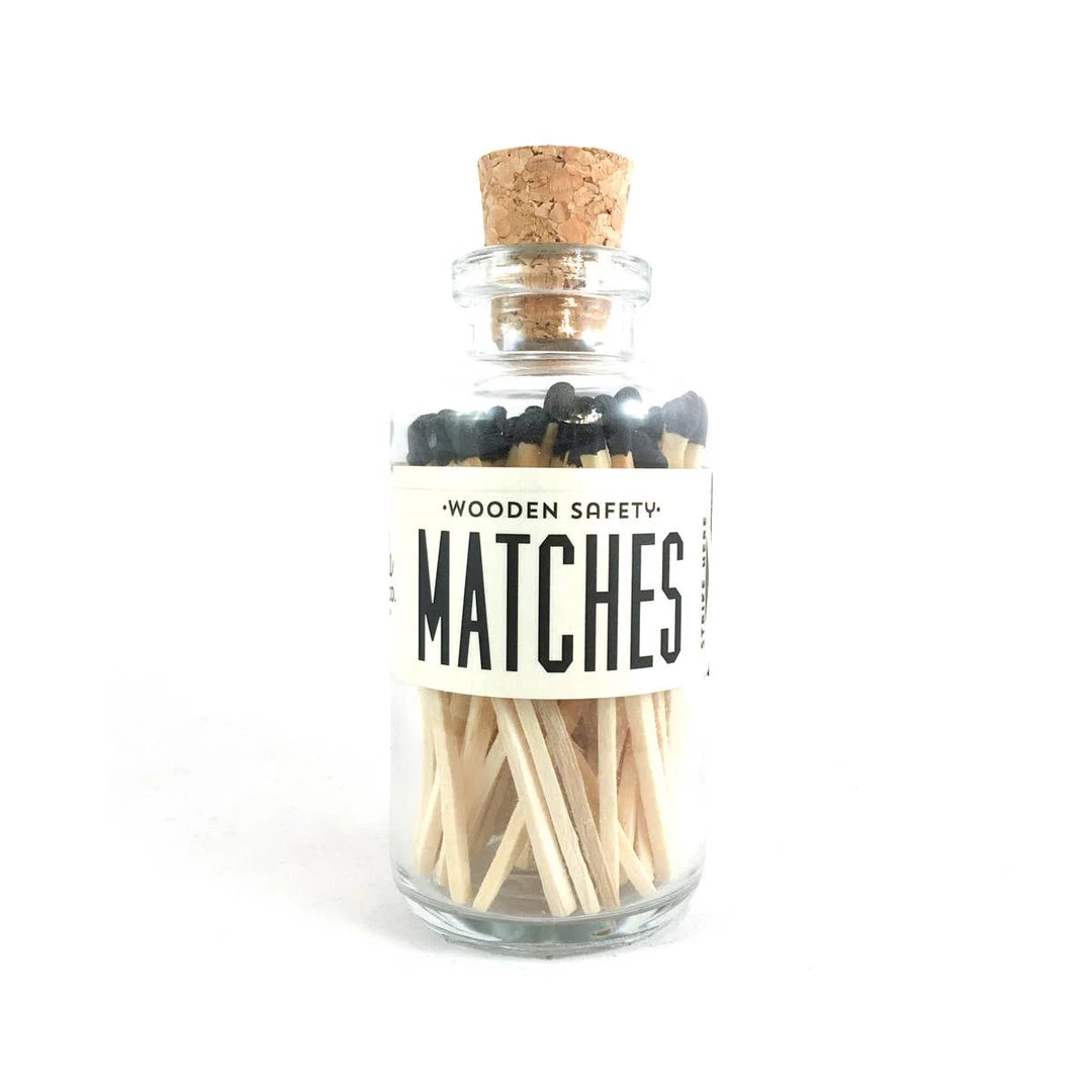 Spark up some joy with these fun mini black matches. These matches come in a glass bottle and striker on the label and everyone is topped with a cork. Wanting something smaller? Then you will adore this “fun size!” She may be little, but she still packs the punch of the original. Nothing was left out….still both beautiful and functional. Vintage labels, playful colors and a functional striker all seamlessly curated for you to enjoy