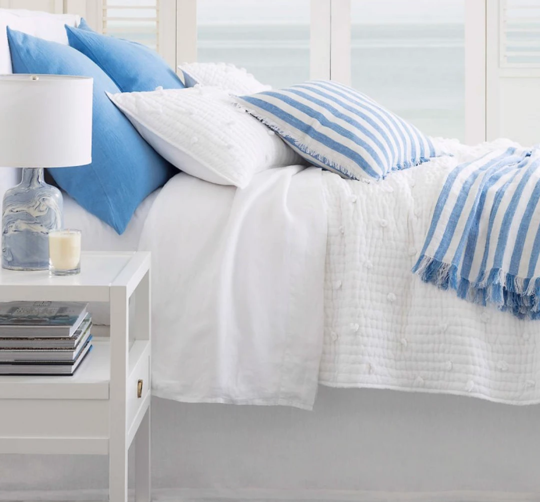 White on white highlights the subtle texture and handmade quality that makes this beautiful bed dressing so unique. The Kantha quilted gauze sham has an incredible fluidity and drape and is irregularly tufted with little scattered Pom Poms in self color for playful whimsy. Crafted by artisans committed to fair-labor practices.