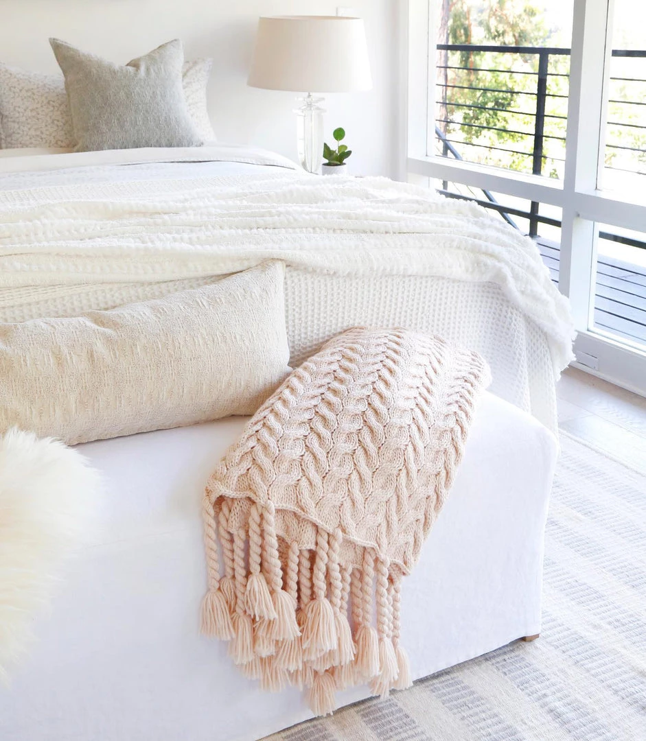 A soft cable knit throw featuring our popular long twisted tassels along the edge. Perfect for a bed, sofa or chair.
