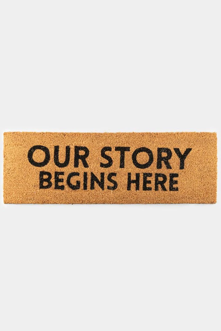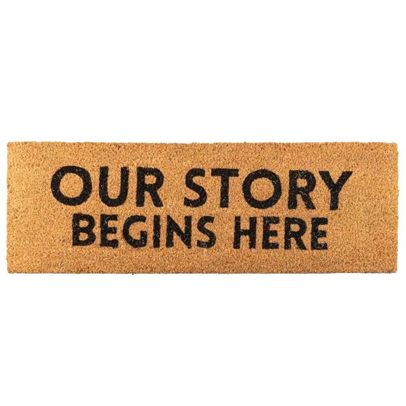 Welcome your guests with this natural rectangular door mat with a unique size that’s ideal for a porch step. It’s “Our Story Begins Here” message makes a perfect gift for a newly-married couple or first home.