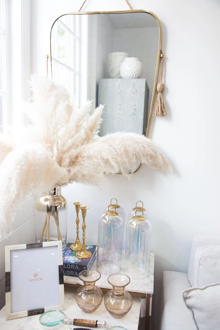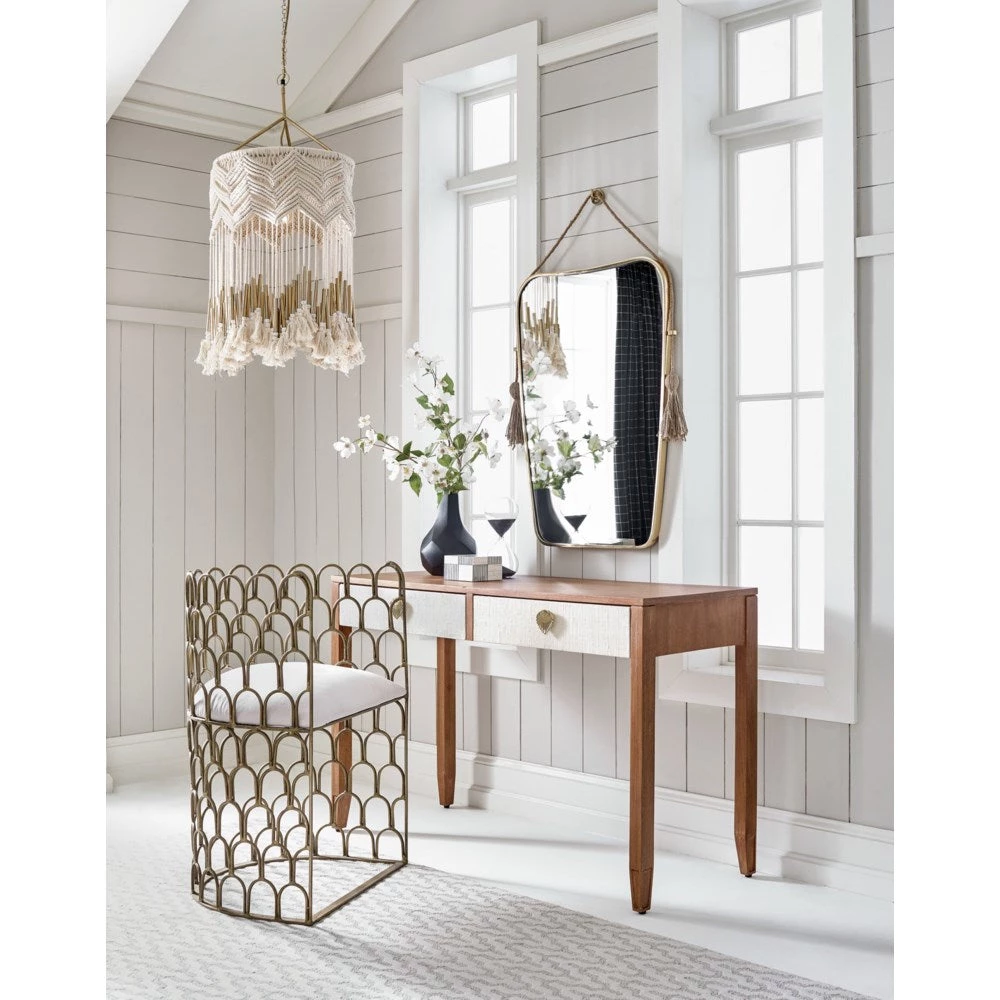 Open up your living room or brighten your bathroom with this chic, rectangular accent mirror. Its slender, classy, timeless molded frame sports a glamorous brass finish, while the flat, non-beveled glass mirror within provides a brilliant reflection, letting light bounce around your space. Adorned with two side tassels brilliantly adds a hint of classic vintage design.