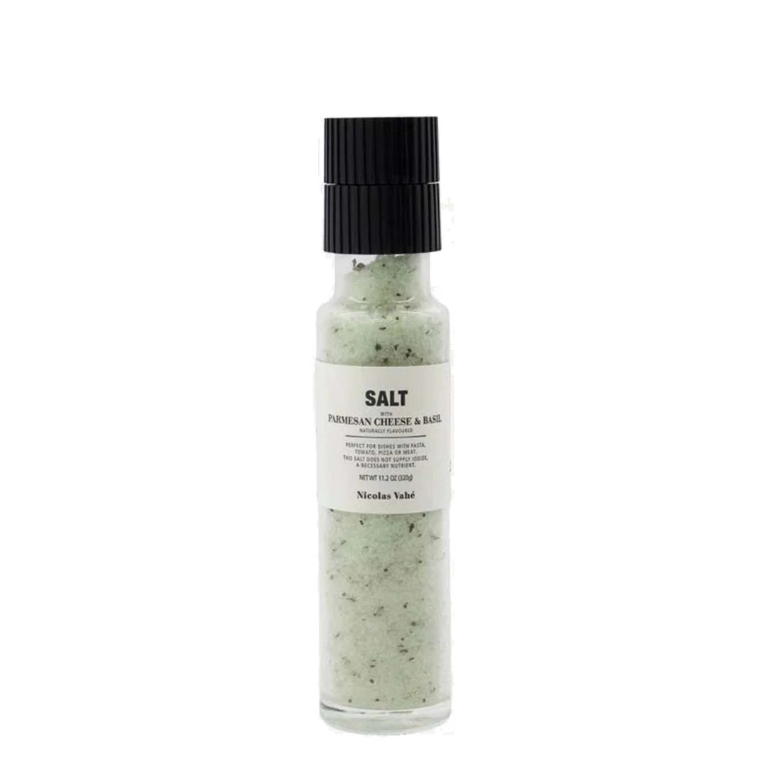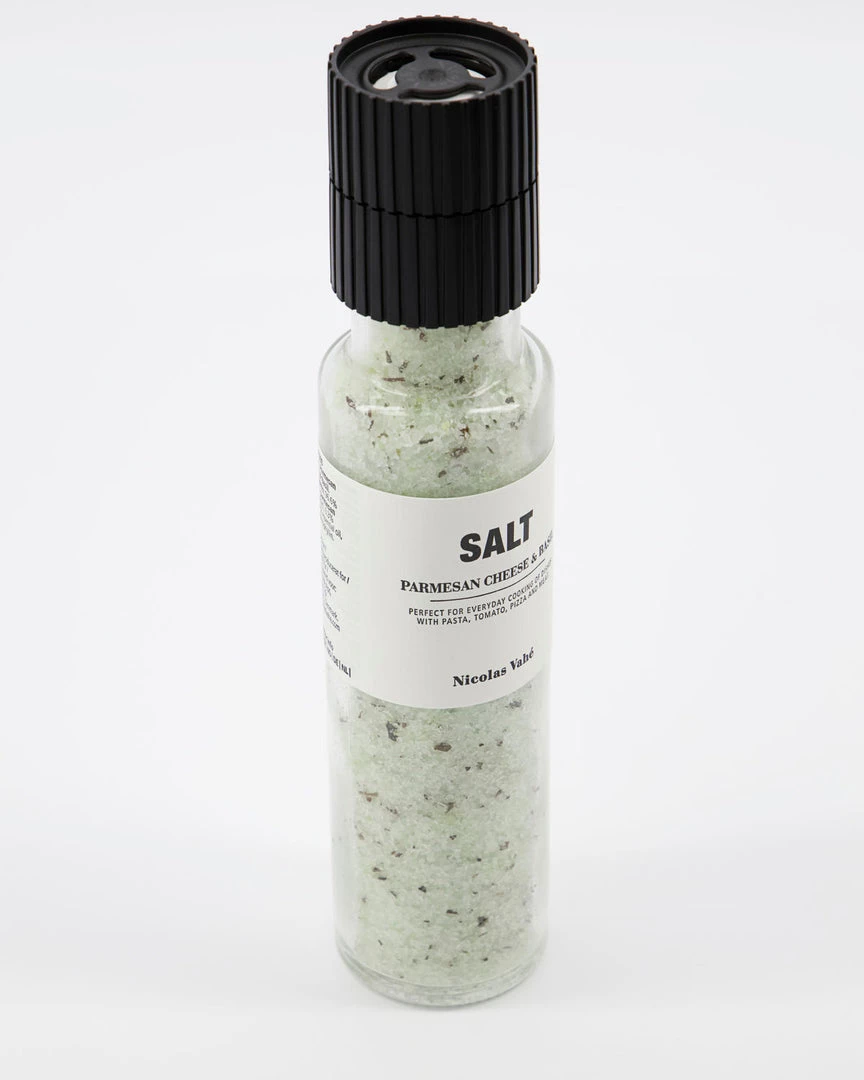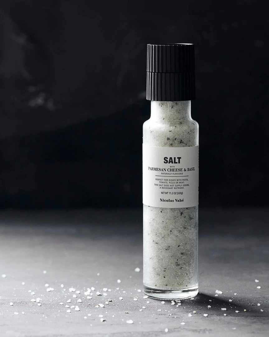 This salt with parmesan cheese and basil is an essential in your cooking. Enjoy the wonderful flavour and the beautiful green colour. It is ideal in pasta dishes and for pizza. The grinder is decorative and can be left out on the kitchen counter when not in use.