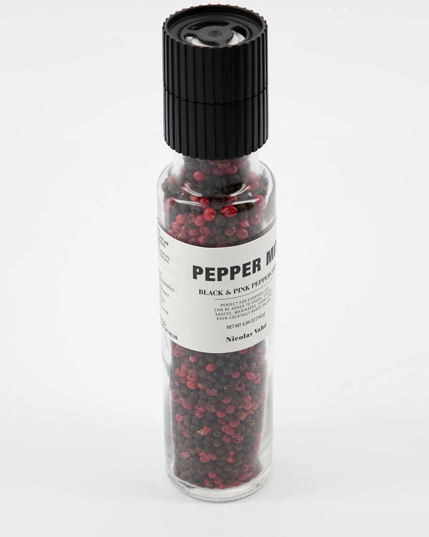 Nicolas Vahé gives you a versatile pepper mix with black and pink peppercorns. The rounded heat of pink peppercorns is closer to that of chili; compared to black peppercorns that are a bit more pungent. You will also notice a fruity undercurrent in the deep flavour that pink peppercorns add to the mix. Elevate the flavours in your cooking and season your dishes with a dash of this pepper mix – from your stews and curries to sauces and marinades. In a gin and tonic, a few pink peppercorns as garnish add a sweet flavour with a subtle heat.