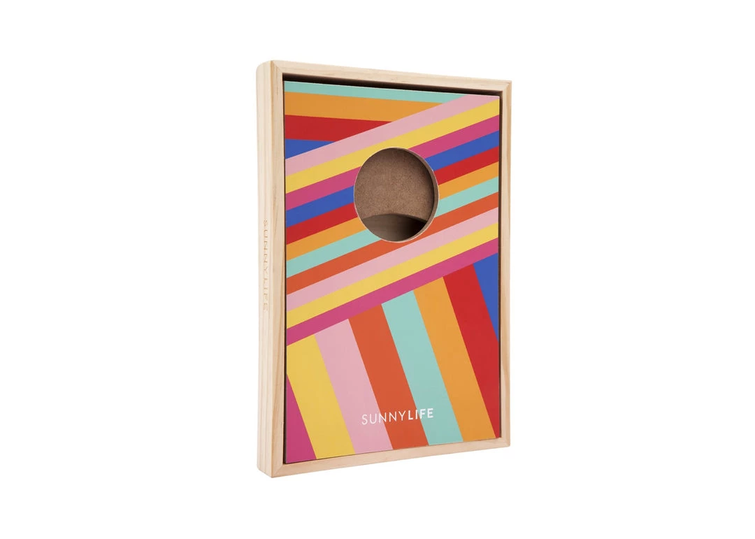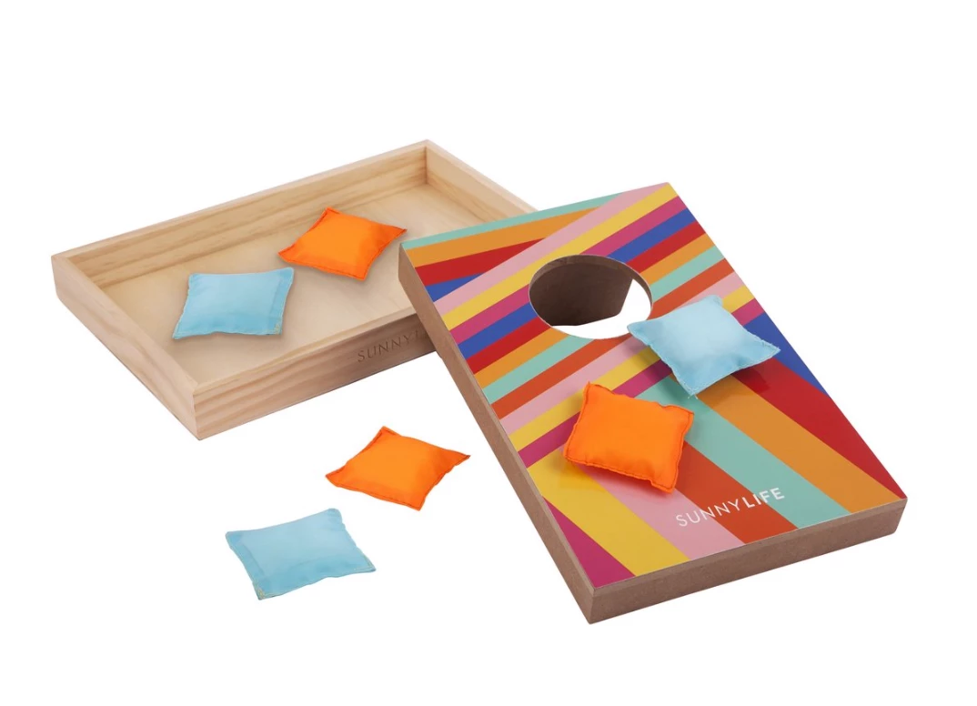 Let the summer games begin. A fun travel-size corn hole is perfect for taking to the beach or even to your next bbq. So fun and bright.