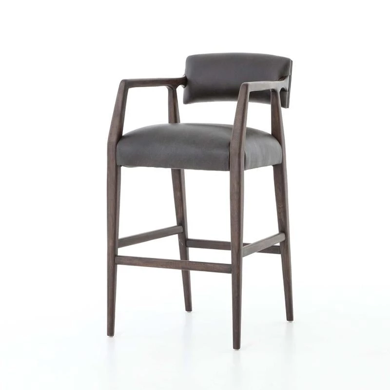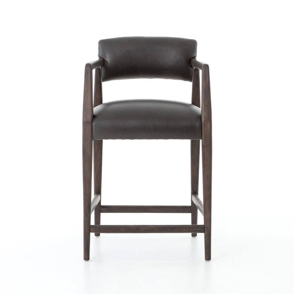Dark and smoky birch frame, deep seat, angular and low-slung back. Beautifully covered in dark leather a counter stool that looks sleek and chic. Perfectly paired in a sleek kitchen to add a little something.