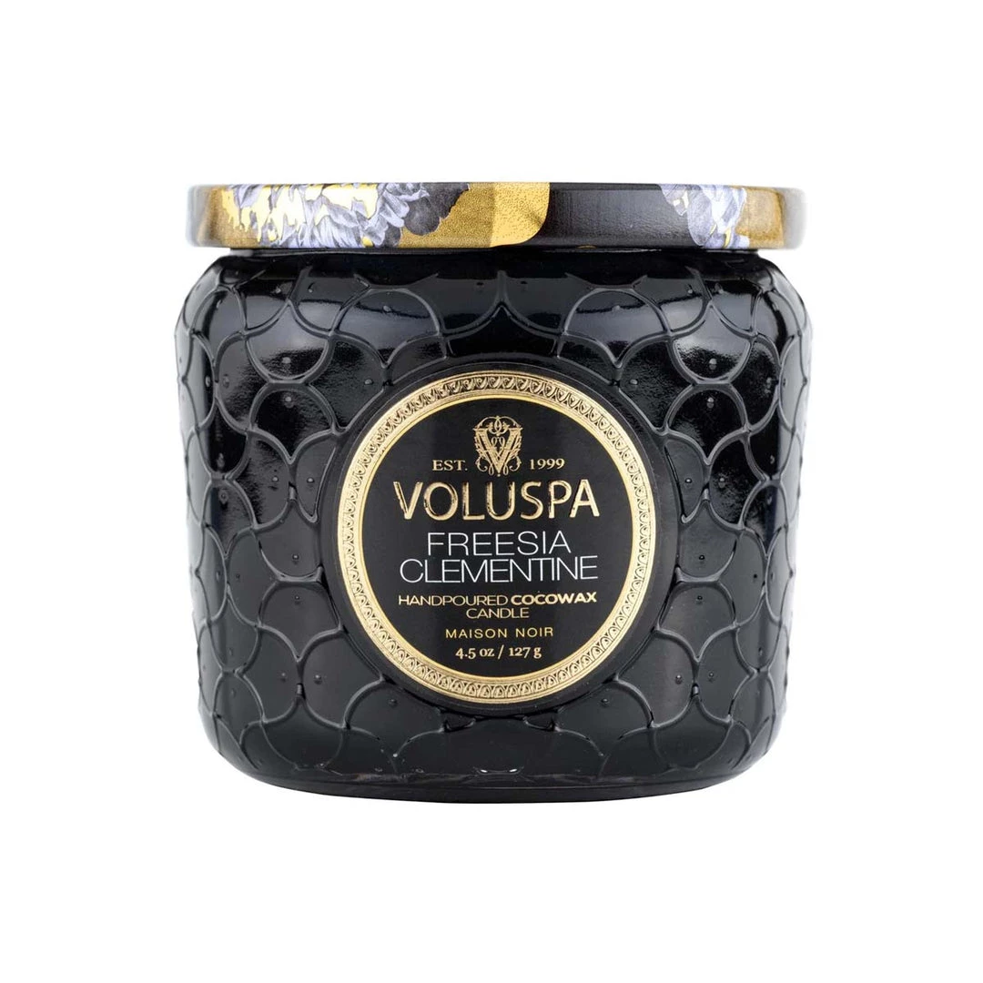 A surprising hint of decor for any space, the Petite Jar Candle is small yet eye-catching with glass embossed in the Maison Collection pattern. A metallic decorative lid can be used to extinguish the flame or keep the candle dust-free when not in use. This candle makes the perfect travel companion or thoughtful gift.