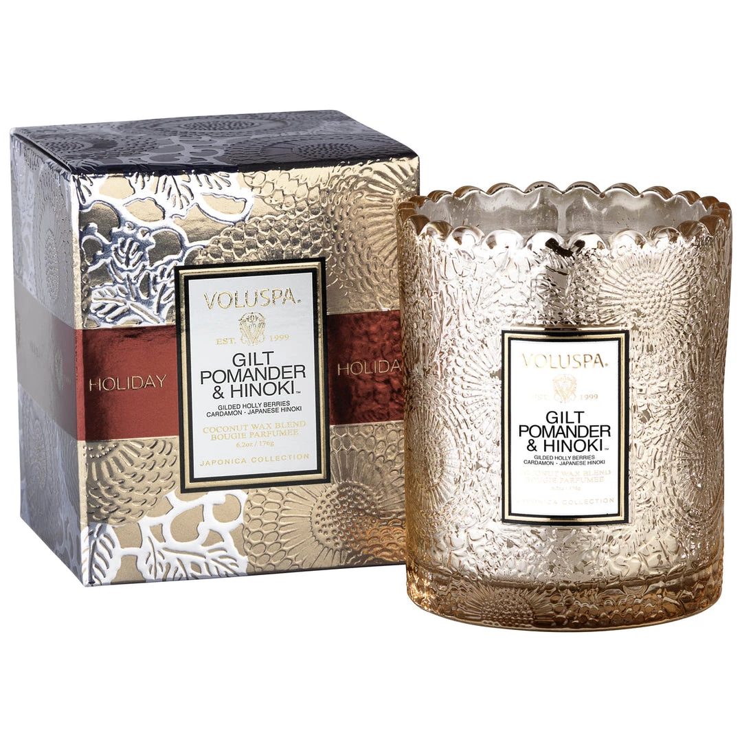 Notes of Golden Spiced Pomander, Holly Berries, Cardamon & Japanese Hinoki.