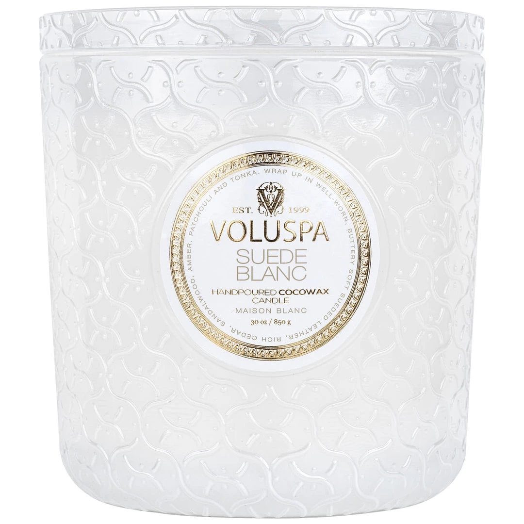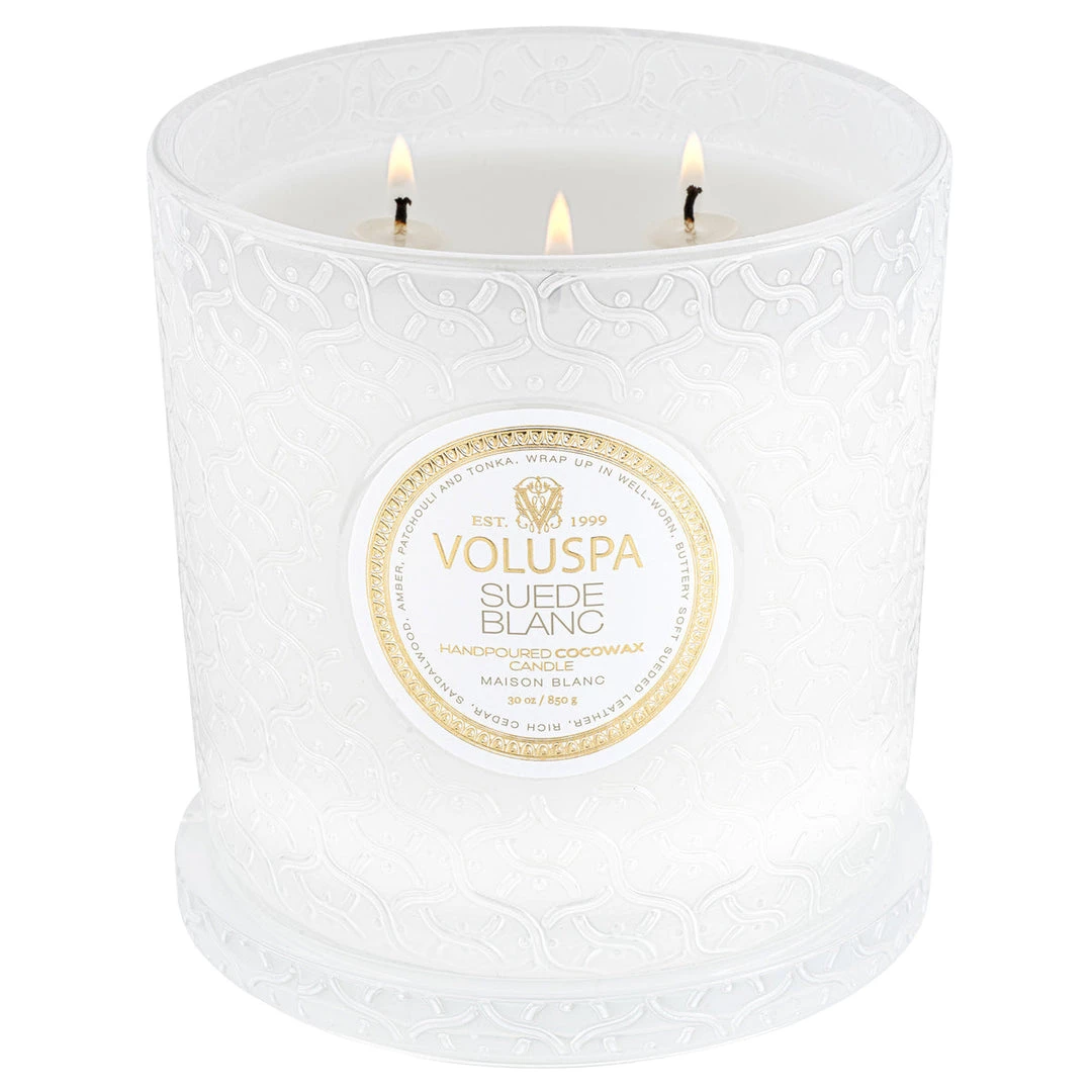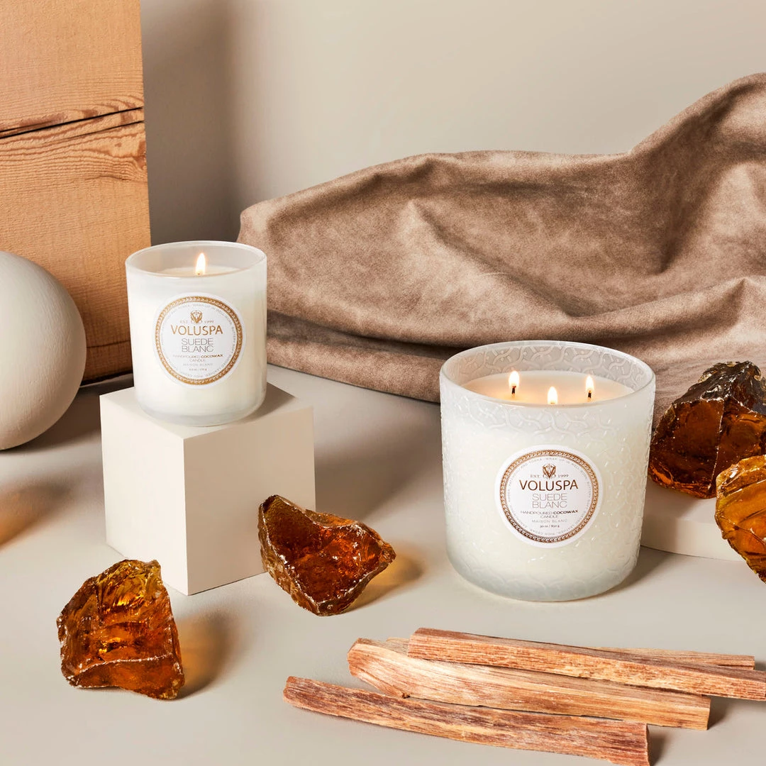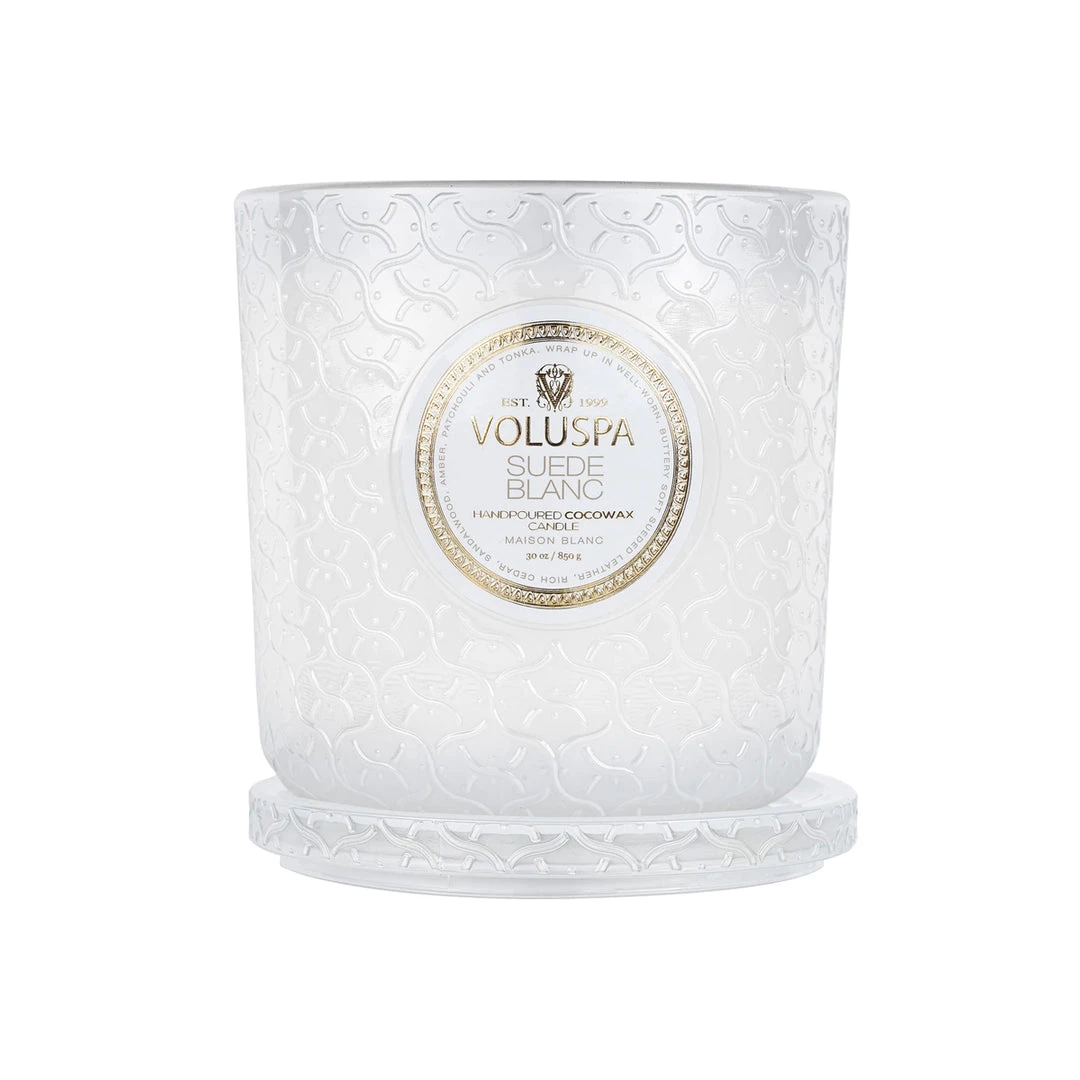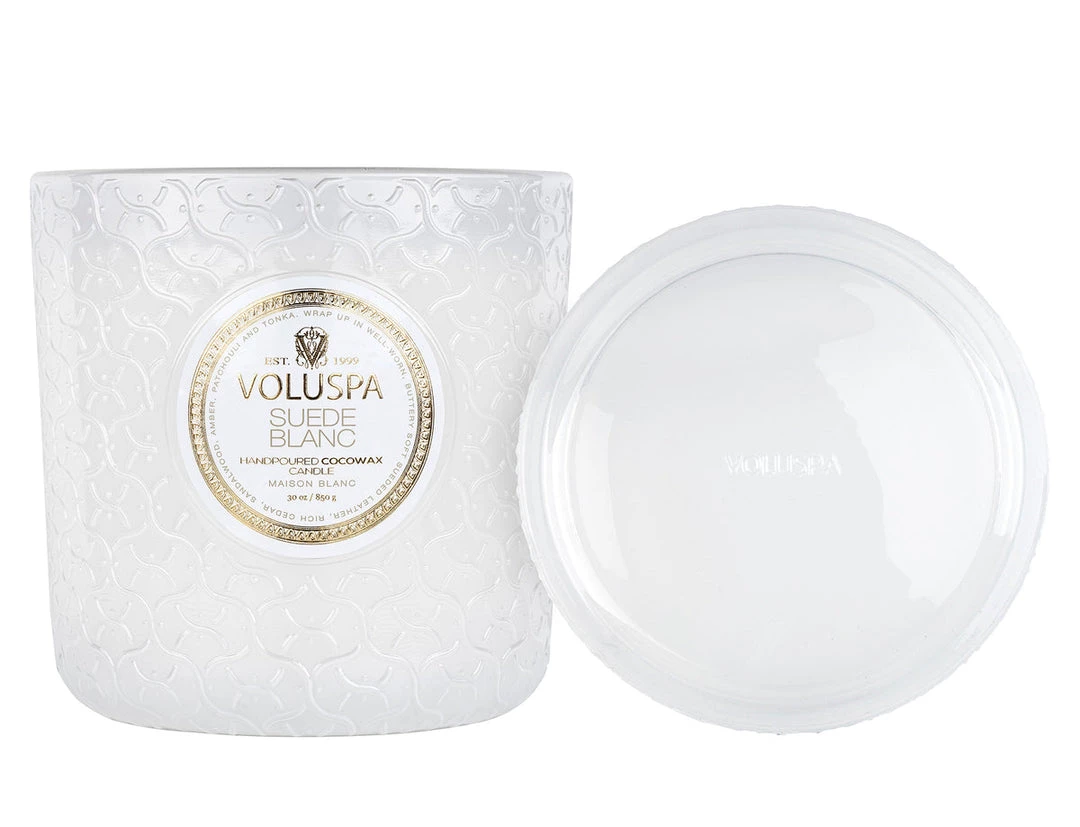 There is no shortage of luxury in our Maison Luxe Jar Candle. Voluspa’s signature Maison pattern wraps the vessel in an elegant emboss from base to lid. The triple wick configuration transforms the ambience with its reflective glow, creating a generous wax pool to ensure abundant fragrance throw. As a finishing touch, the candle is perfectly designed to fit in the depression of the lid when lit.