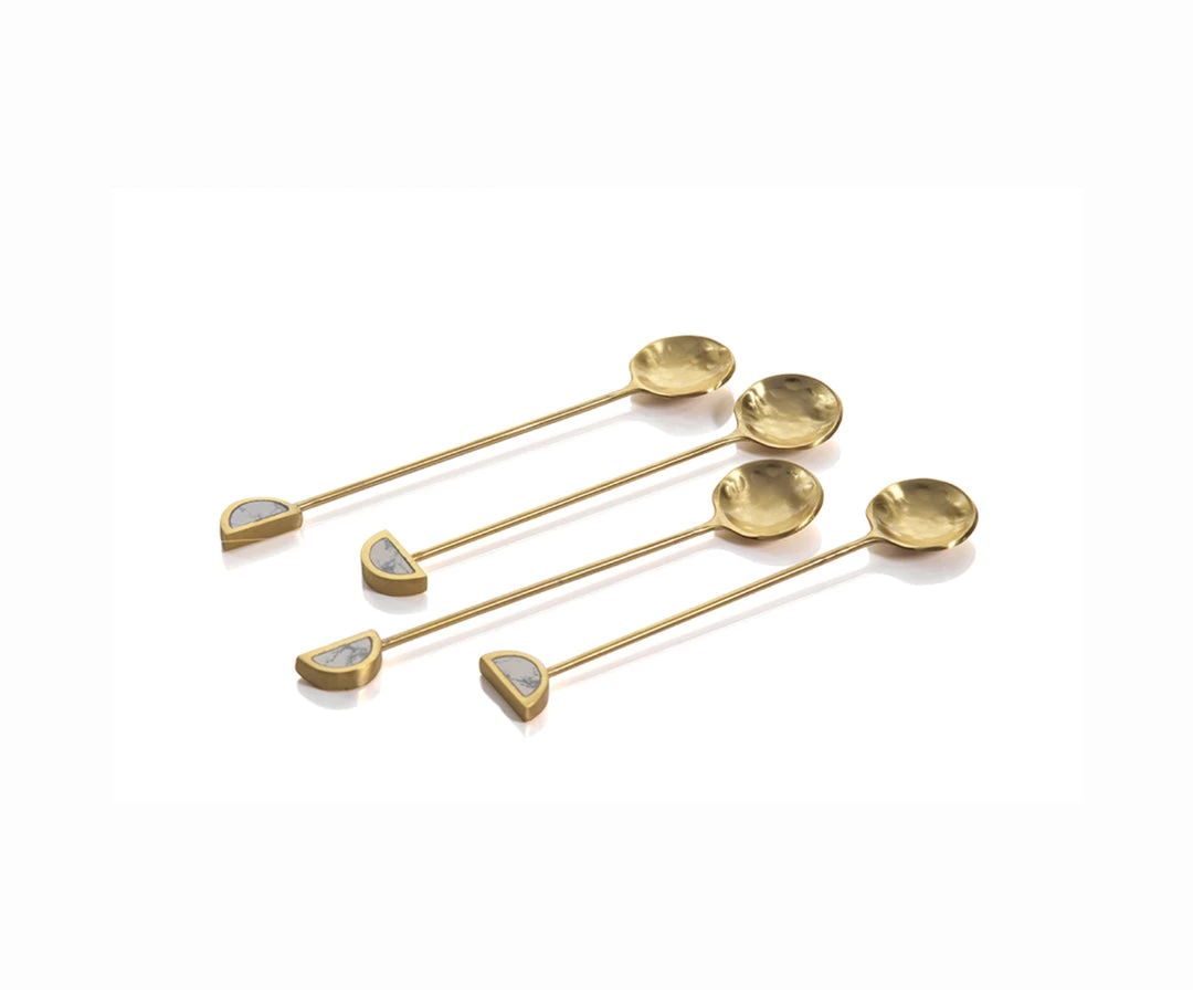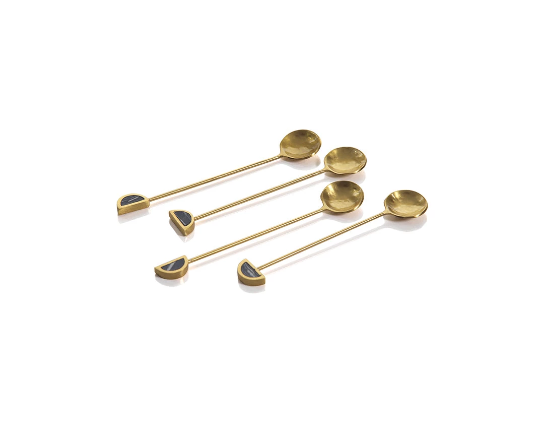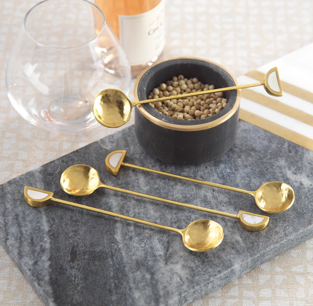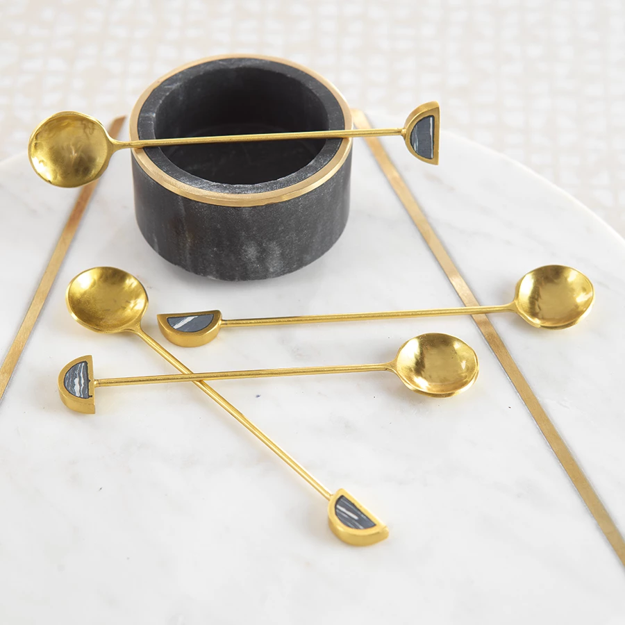 Chic teaspoons exist! And here they are. Funky geometric tea spoons for your next party! Perfect for loose leaf teas, spices, and stirring up small cocktails. Small-sized spoon features a half moon shaped design in at the end of the handle in black or white marble. Made of durable stainless steel plated in gold for a timeless but trendy look.